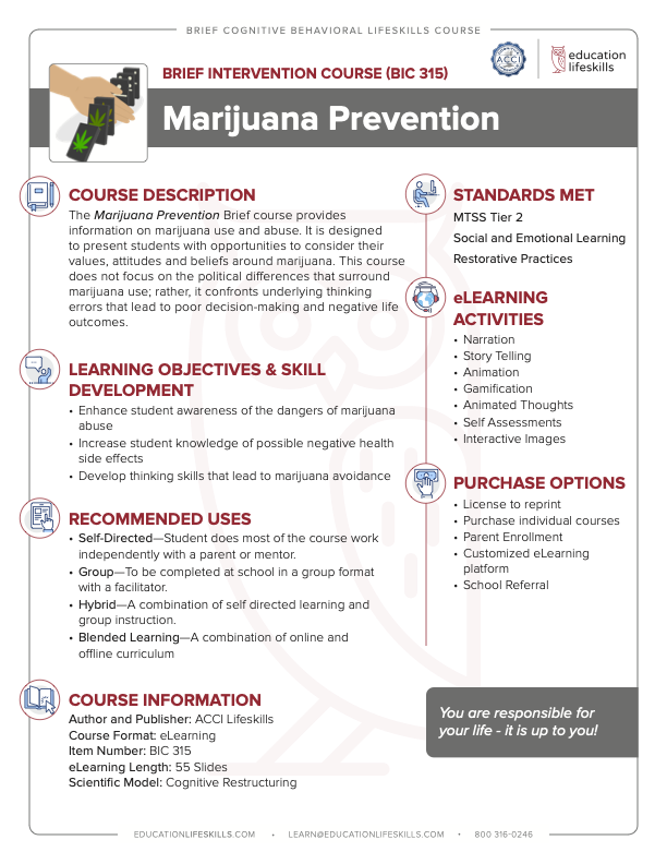 Brief Marijuana Prevention Courses Brief Marijuana Prevention Take course online Demo Course Download overview Are you a school or district? Contact sales rep